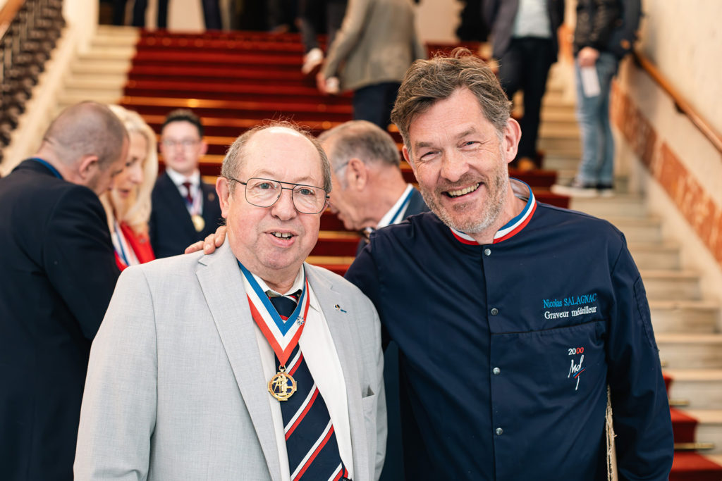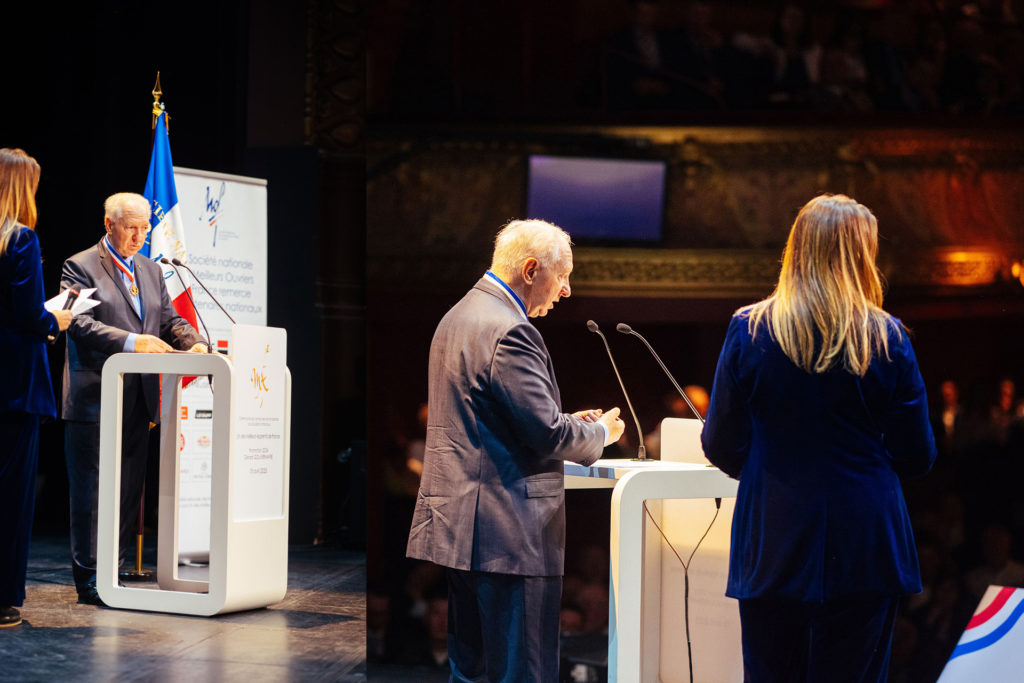 Le Président de la Société Nationale des Meilleurs Ouvriers de France, Jean-François Girardin avec la présentatrice Carinne Teyssandier.