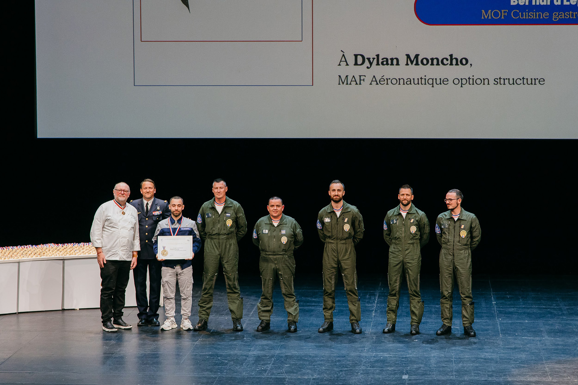 La présentatrice Carinne Teyssandier invite la Patrouille de France sur scène pour remettre la médaille et le diplôme au jeune lauréat Dylan MONCHO, MAF en aéronautique structure.