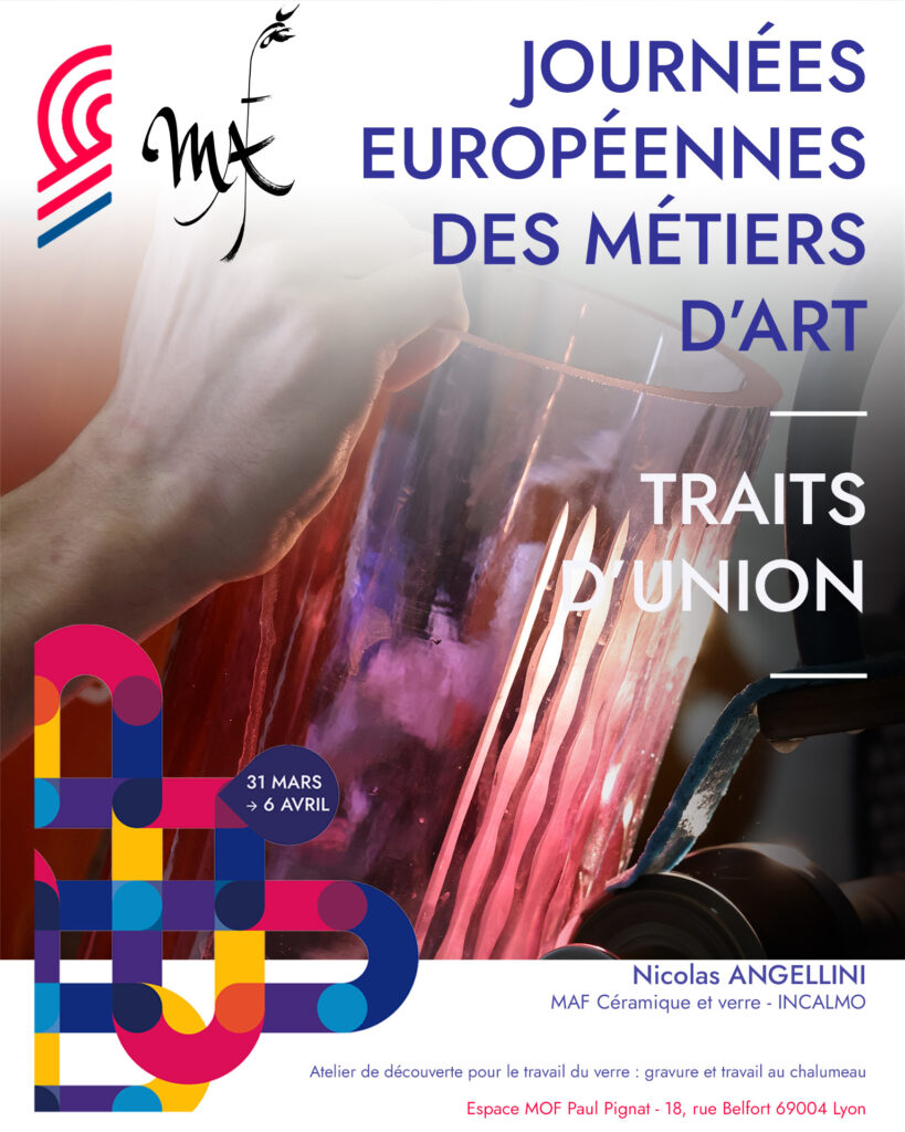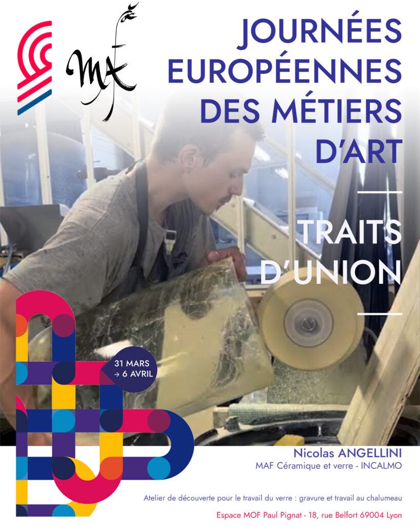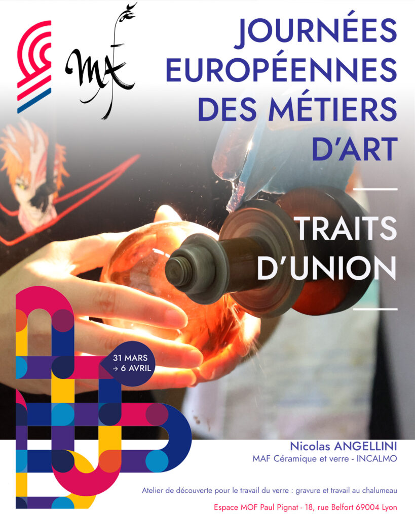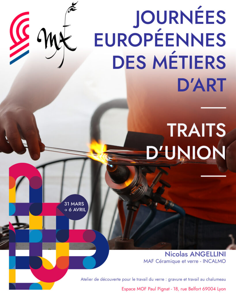 • Soufflage et gravure sur verre avec Nicolas Angelini (MAF souffleur de verre) : découverte du travail du verre en fusion au chalumeau et initiation à la gravure sur verre.